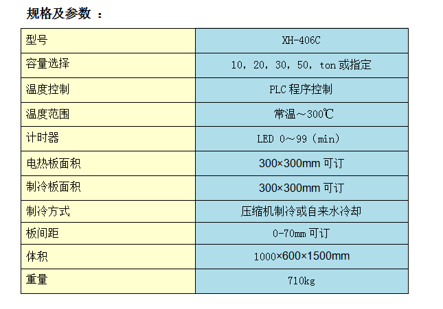 其主要功能是將原料放于鑄模內,夾于本機電熱平板間,加以壓力及溫度,以供試驗,做為工廠大量生產配料之依據.